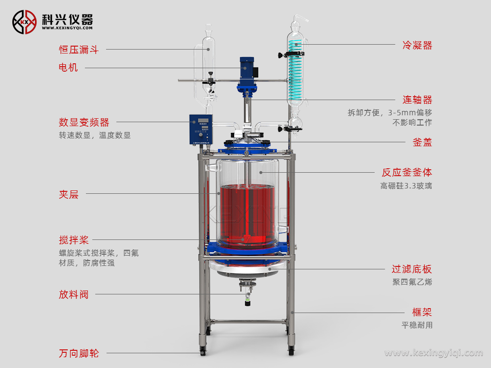 主要用于制藥、化工、實(shí)驗(yàn)室等機(jī)構(gòu)的有機(jī)合成實(shí)驗(yàn)室用中式設(shè)備,用于有機(jī)物合成實(shí)驗(yàn)中,是生化制藥中的主要設(shè)備之一。釜體為雙層玻璃燒結(jié)而成,雙層之間可通過(guò)冷卻液和加熱液。釜底過(guò)濾篩板的設(shè)計(jì),讓設(shè)備能承受100KG反應(yīng)液的壓力。過(guò)濾裝置采用法蘭和四氟材料制成與釜體相連,過(guò)濾器為玻璃砂芯,方便拆卸清洗更換。